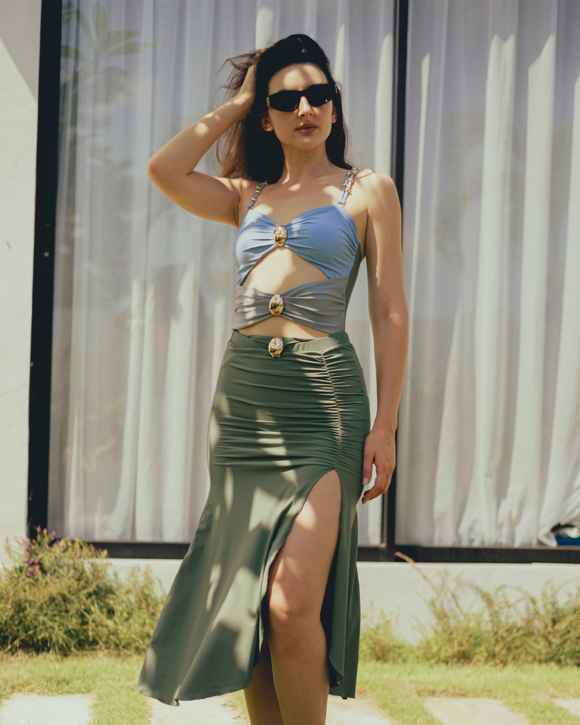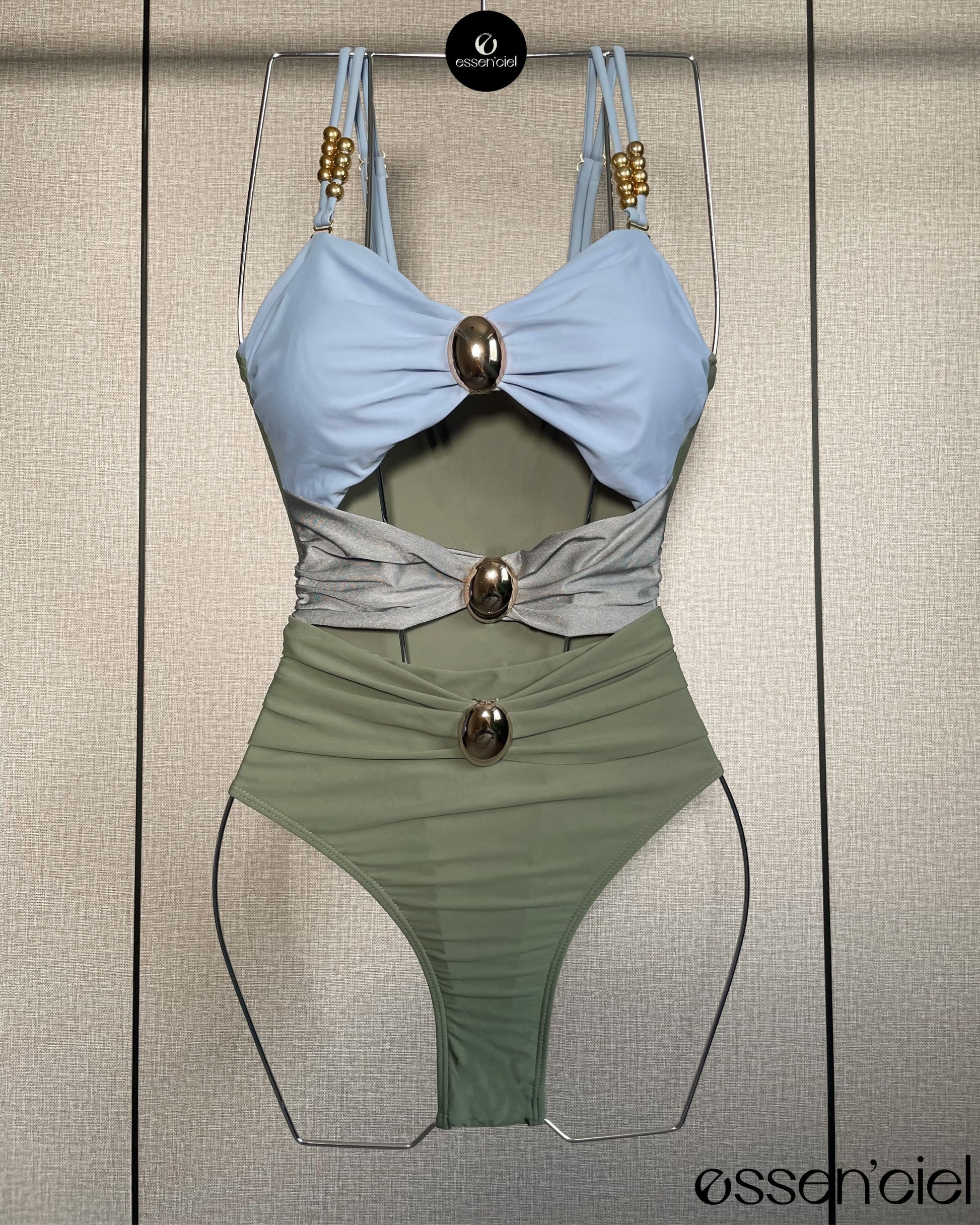 Discover the Bermuda Luxury Women Swimsuit Set from Essen’Ciel, featuring a stylish bikini top with gold-toned embellishments, high-waisted bottoms, and a versatile sarong that doubles as a maxi dress. Designed for the confident and stylish woman, this set embodies luxury and elegance.