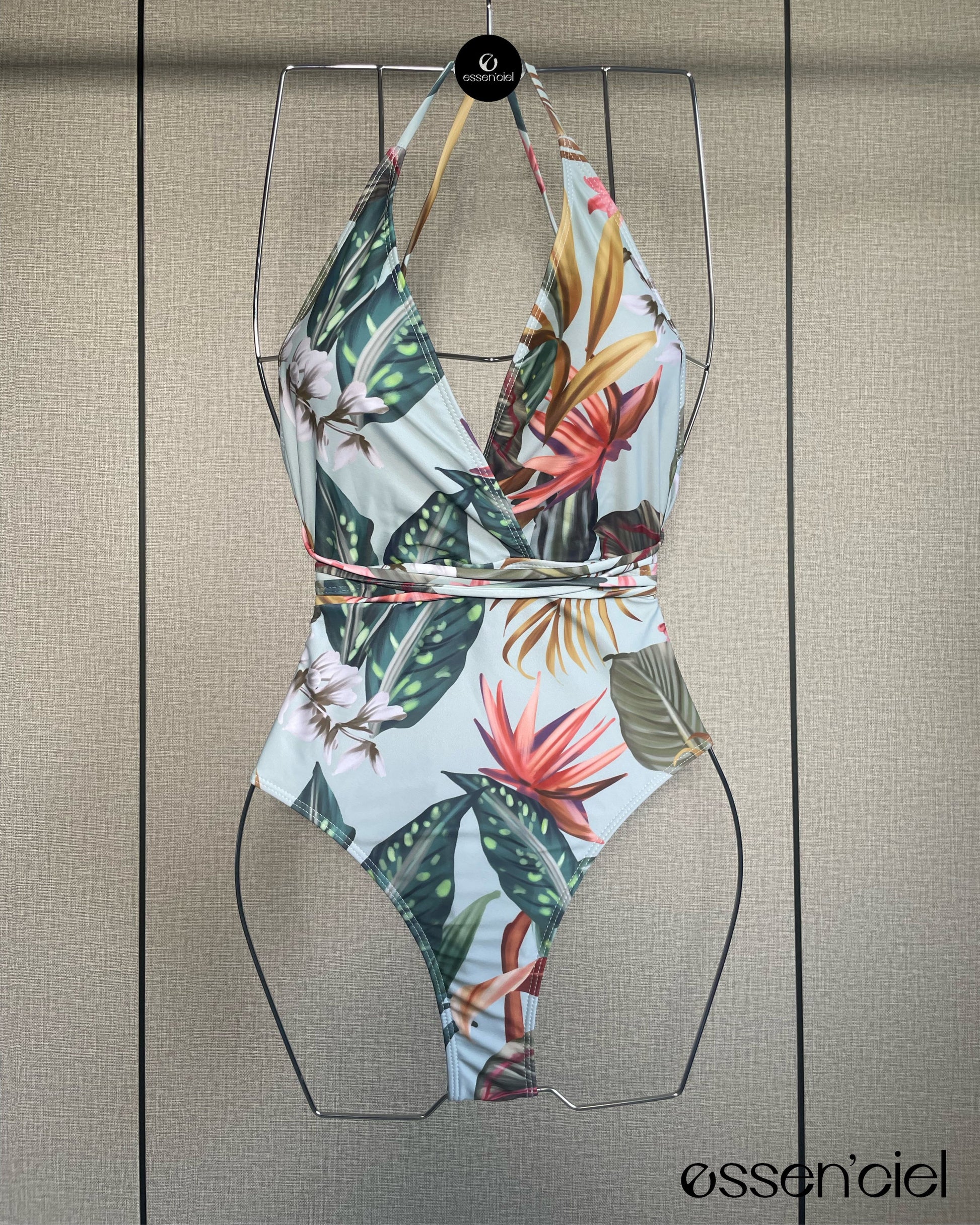 Dive into tropical vibes with the Hawaii V-Neck One Piece Swimsuit from Essen’Ciel. This swimsuit features a classic V-neck design adorned with a striking pattern of green and coral leaves. The Hawaii swimsuit offers both style and comfort, making it perfect for any beach or poolside occasion. The V-neckline and vibrant colors bring a fresh, bold look, ideal for those who love to make a statement. Whether you're on vacation or enjoying a sunny day by the water, the Hawaii swimsuit is your go-to for a tropical style.