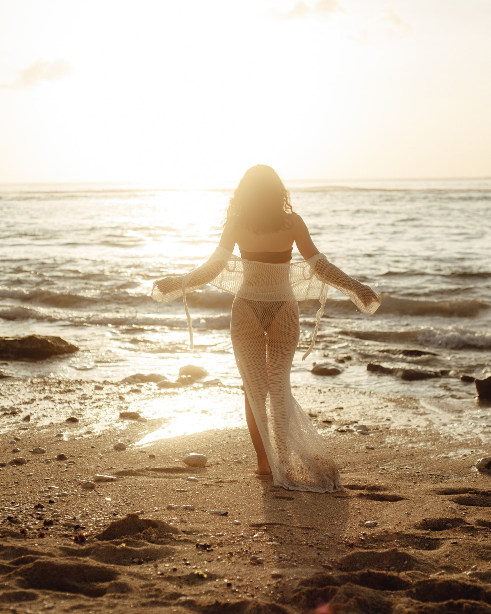 Breezy Majorca White Two-Piece Mesh Tie-Front Beach Set is the ultimate cover-up combo for sun-drenched days. Featuring a long-sleeve crop top with a front tie and a matching wrap-style mesh skirt, this lightweight duo is made for easy layering over your favorite swimwear.